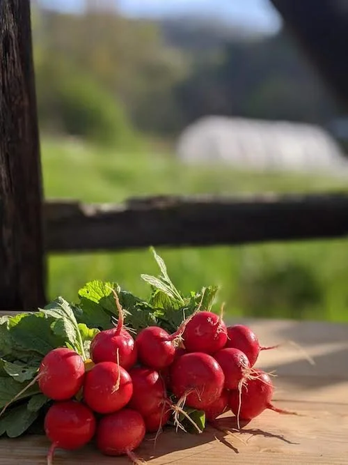 Crisp, fresh & just the right amount of spice. Enjoy the greens too, best sautéed. Sold in bundles of 8-10 radishes each, with greens! This picture shows two bunches.